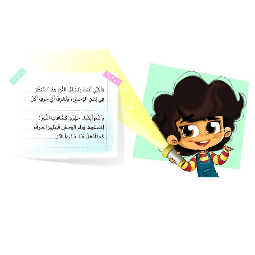 باستخدام الكشَّاف، سنرى الحرف المخبَّئا في بطن الوحش، فأطفالنا يحبُّون أن نثير شغفهم ليزداد فضولهم بمعرفة الأشياء، فما ألذ حرف يضيء في بطن وحش ظريف!