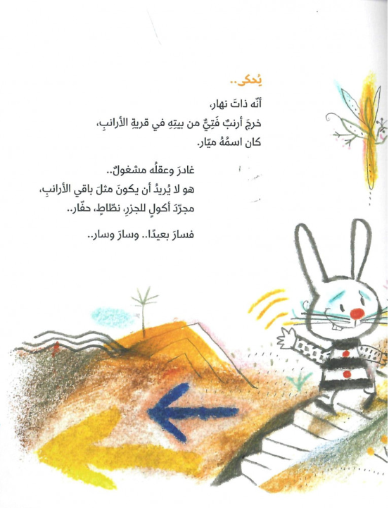 أرنب مختلف ، لا يريد أن يكون كبقية إخوته آكل للجـزر ! ويريد أن يكون أكثـر مـن مجـرد نطاط وحفـار . سار بعيداً يتعلـم مـن بقية الأصدقاء، عمل فلاحا ونجارا وبناء! رافـق الصغار والكبار ومع ذلك لم يجـد ما يرضيه، ضل يرحل من مكان إلى مكان، وصل لعدة مدن وقبائل، لكل منهم مشكلة فكر ميـار وفكر، إلى أن توصل لحلها، وساعد بها أهل تلك المدن في إحدى المدن، دعى ميار أهلها لحفر الآبار لجمع المياه، وفي مدينة أخرى استطاع كشف اللص، أما في مدينة الخير التي كثر ثمار فاكهتها عرض عليهم طبخها وتخزينها وتحويلها لمربي. ومنذ ذاك الوقت عرف ميارب المفكار، ولـم يعـد كبقية الأرانب يأكل الجزر، نطاط و حفار.
